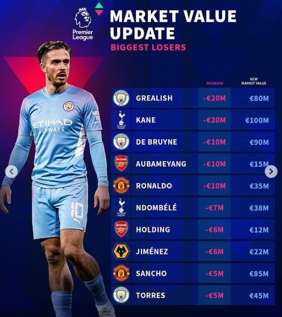 日前,德国转会市场更新的英超球星的即时身价,并列出了跌幅榜的前10位,曼城标王格拉利什下跌了2000万,热刺前锋凯恩也下跌了2000万。C罗下降了1000万,目前的即时身价为3500万欧元。