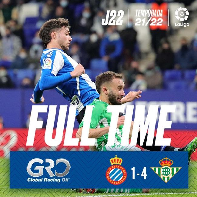 北京时间1月22日4:00(西班牙当地时间21:00),2021/22赛季西甲第22轮焦点战展开角逐,西班牙人主场1-4不敌贝蒂斯,德托马斯破门,伊格莱西亚斯扳平,圭多-罗德里格斯破门反超,伊格莱西亚斯和威廉-若泽再进两球扩大比分,德托马斯两黄被罚下。武磊未出场。
