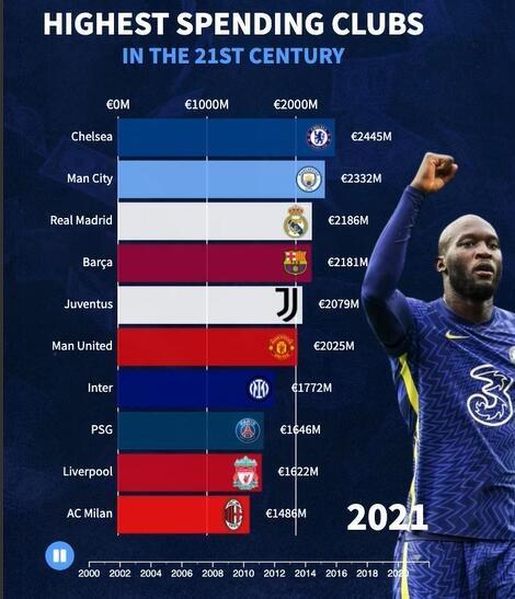 21世纪俱乐部烧钱榜:切尔西24亿第一曼城第二