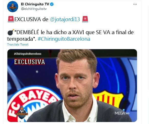 据西班牙电视六台的知名节目“沙滩酒吧”透露,登贝莱已经告诉哈维,自己将在赛季结束后离开巴萨。届时他将免费离队。