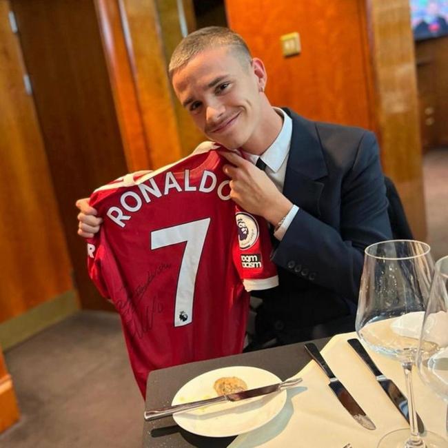 现年19岁的罗密欧效力于父亲在劳德代尔堡的球队,举起C罗签名的7号球衣,脸上洋溢着笑容。